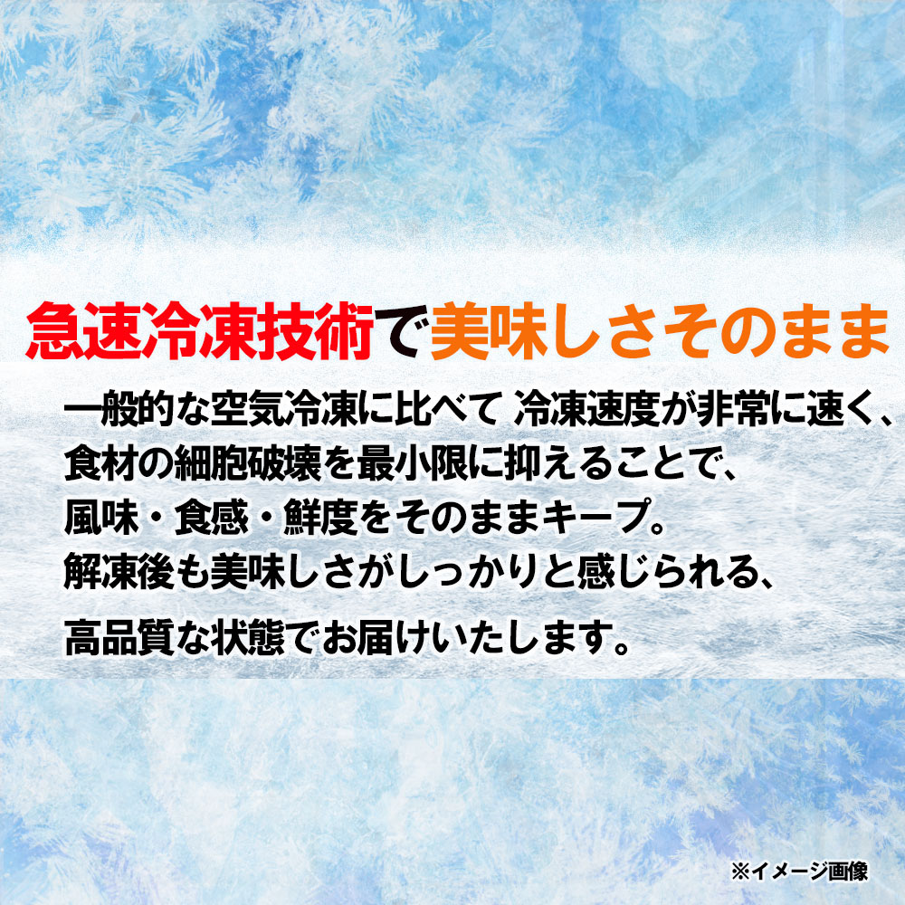 一般的な空気冷凍に比べて冷凍速度が非常に速く、食材の細胞破壊を最小限に抑えることで、 風味・食感・鮮度をそのままキープ。 解凍後も美味しさがしっかりと感じられる、高品質な状態でお届けいたします。